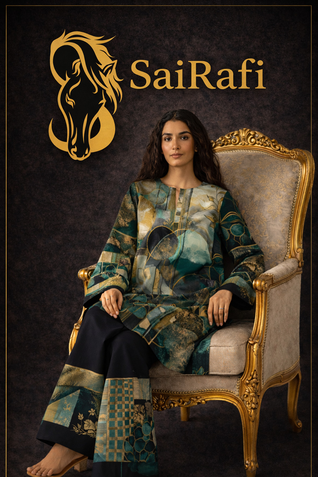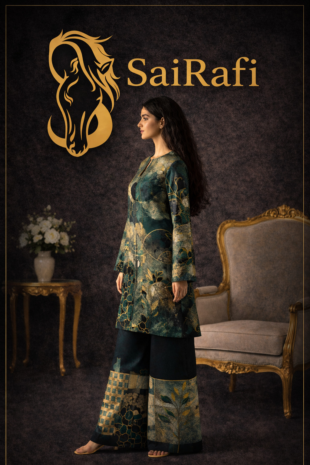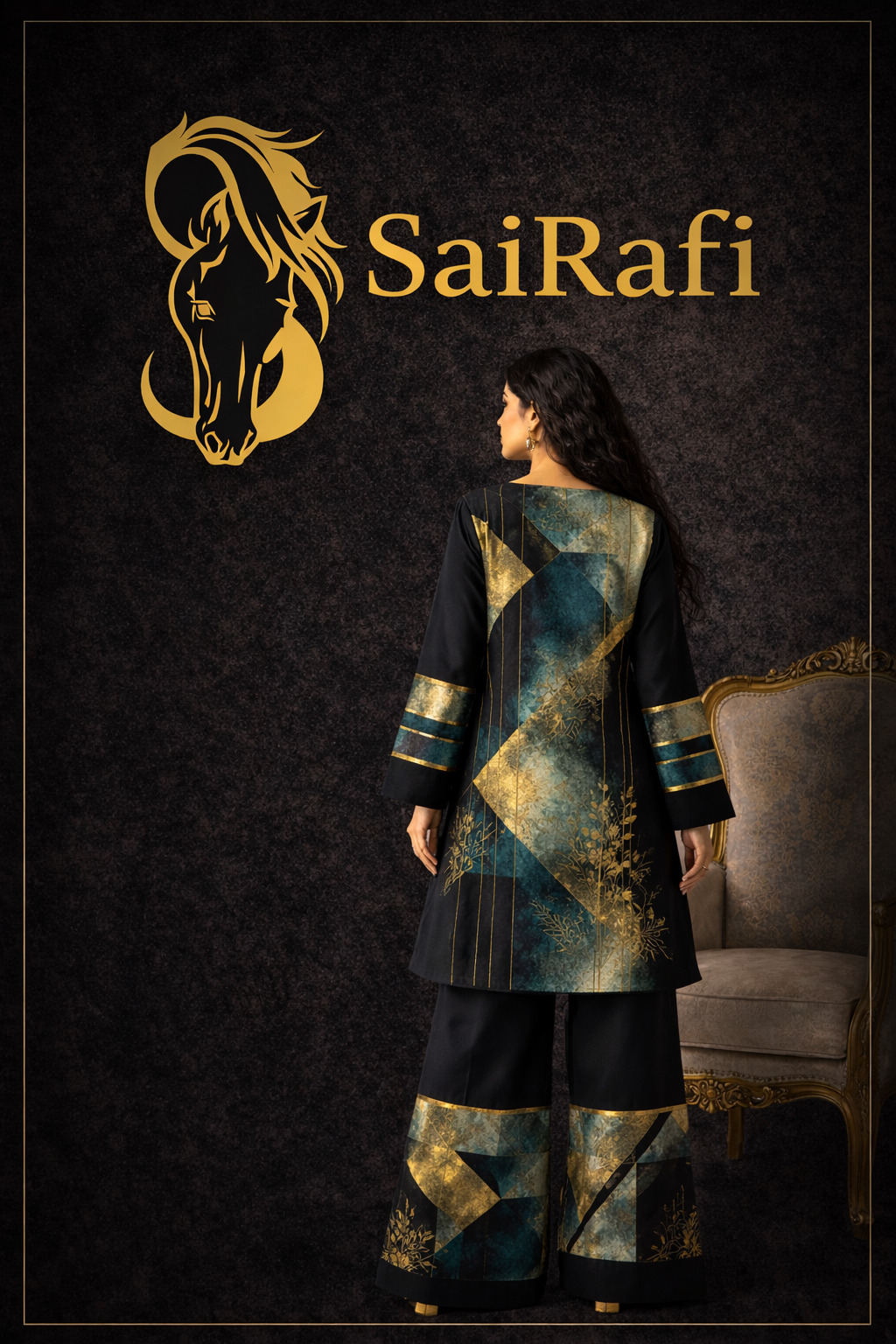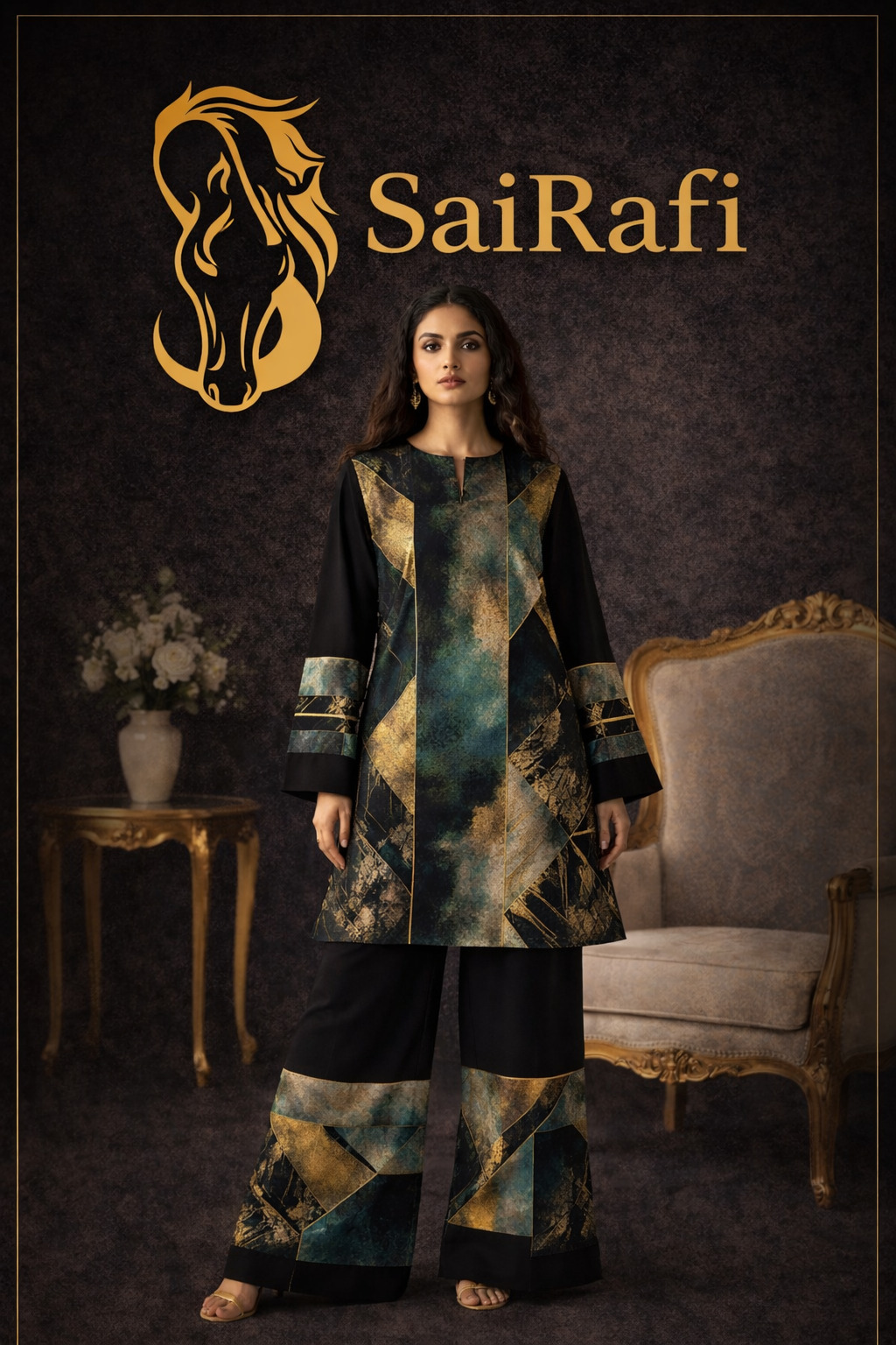 This outfit by SaiRafi showcases a refined blend of modern geometric design and luxury aesthetics. The ensemble features a straight-cut tunic paired with wide-leg trousers, creating a balanced and contemporary silhouette.